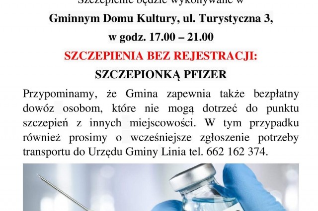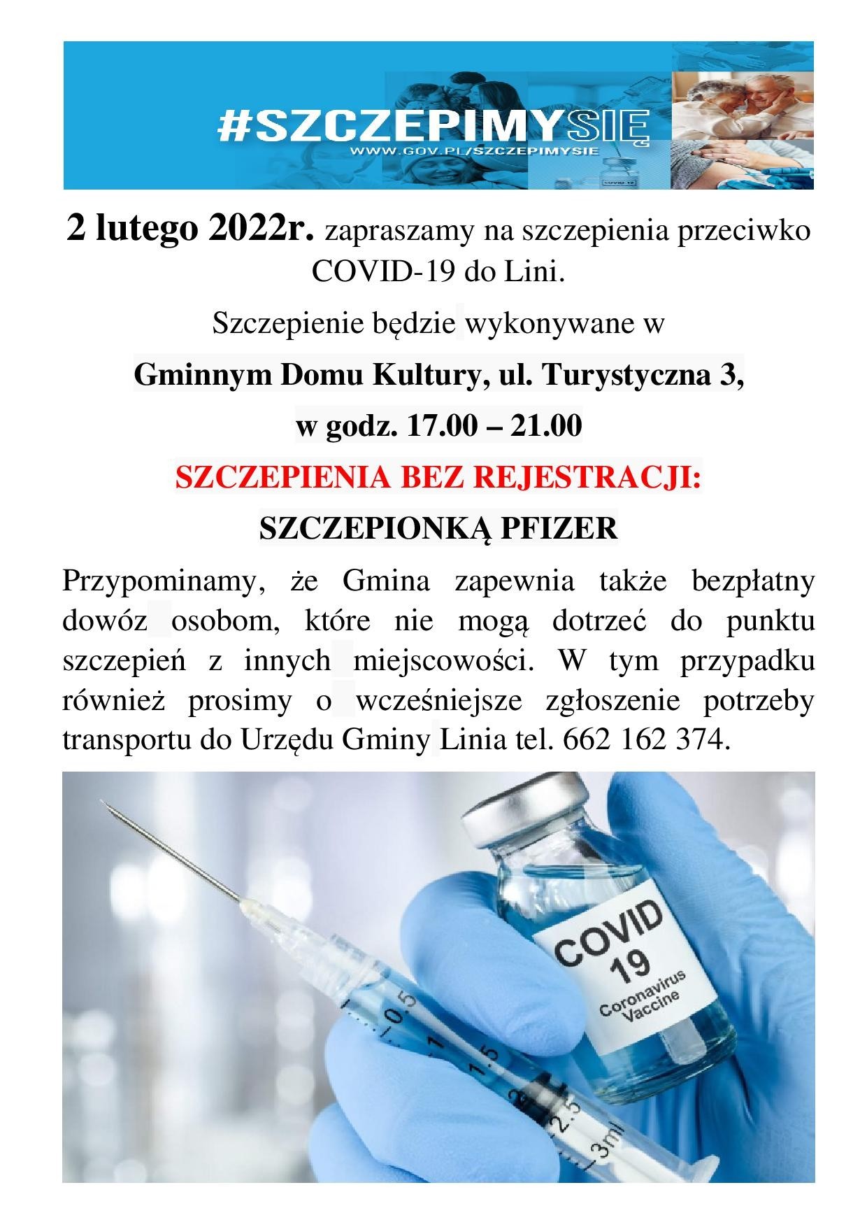 2 lutego 2022r. zapraszamy na szczepienia przeciwko COVID-19 do Lini.