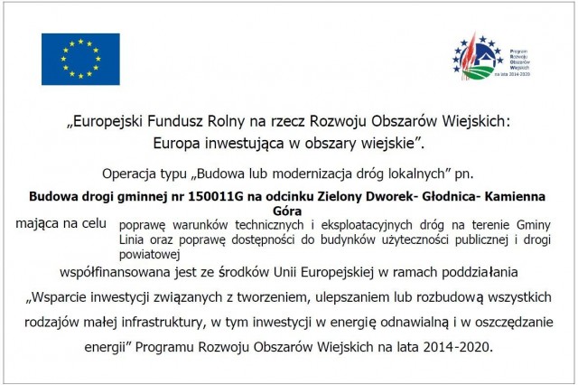 "Budowa drogi gminnej nr 150011G na odcinku Zielony Dworek- Głodnica- Kamienna Góra"