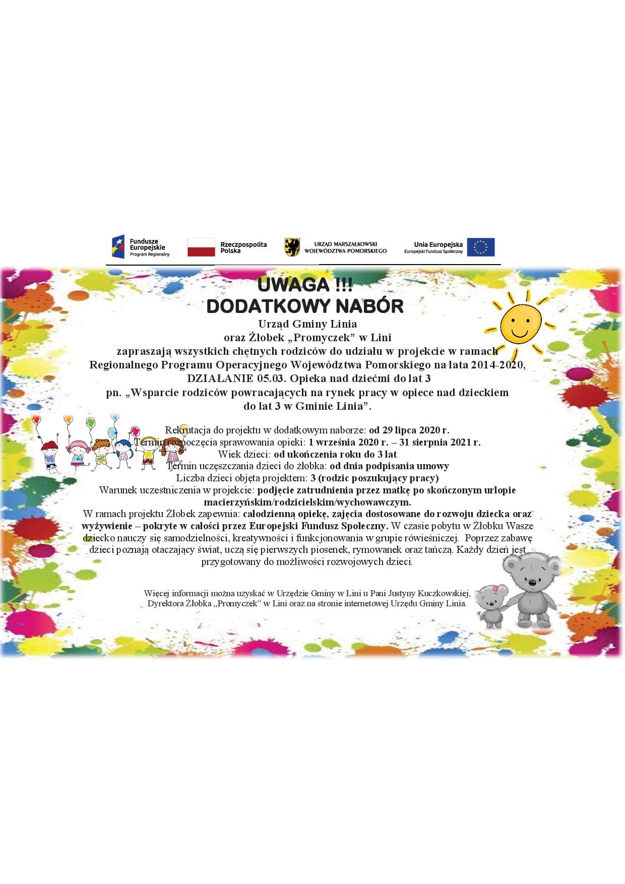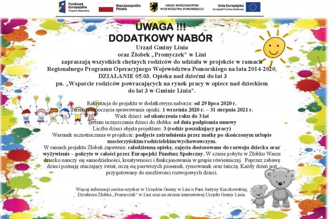 „Wsparcie rodziców powracających na rynek pracy w opiece nad dzieckiem do lat 3 w Gminie Linia” realizowanego w ramach działania 05.03 Opieka nad dziećmi do lat 3