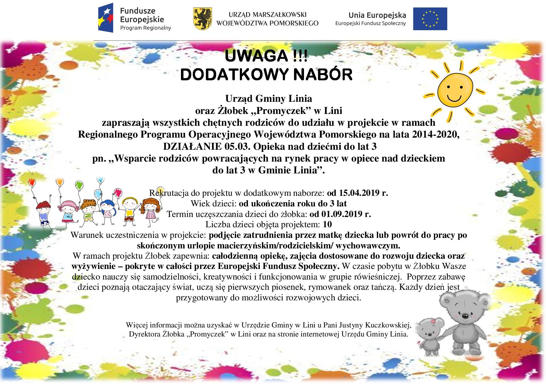 Nabór do projektu "Wsparcie rodziców powracających na rynek pracy w opiece nad dieckiem do lat 3 w Gminie Linia"