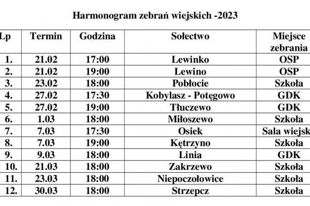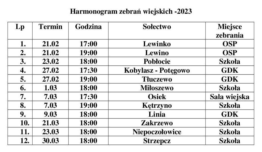 | Lp | Termin | Godzina | Sołectwo | Miejsce zebrania |
