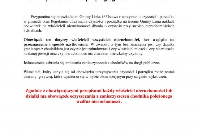 Informacja o utrzymaniu czystości i porządku w obrębie chodnika przyległego do nieruchomości