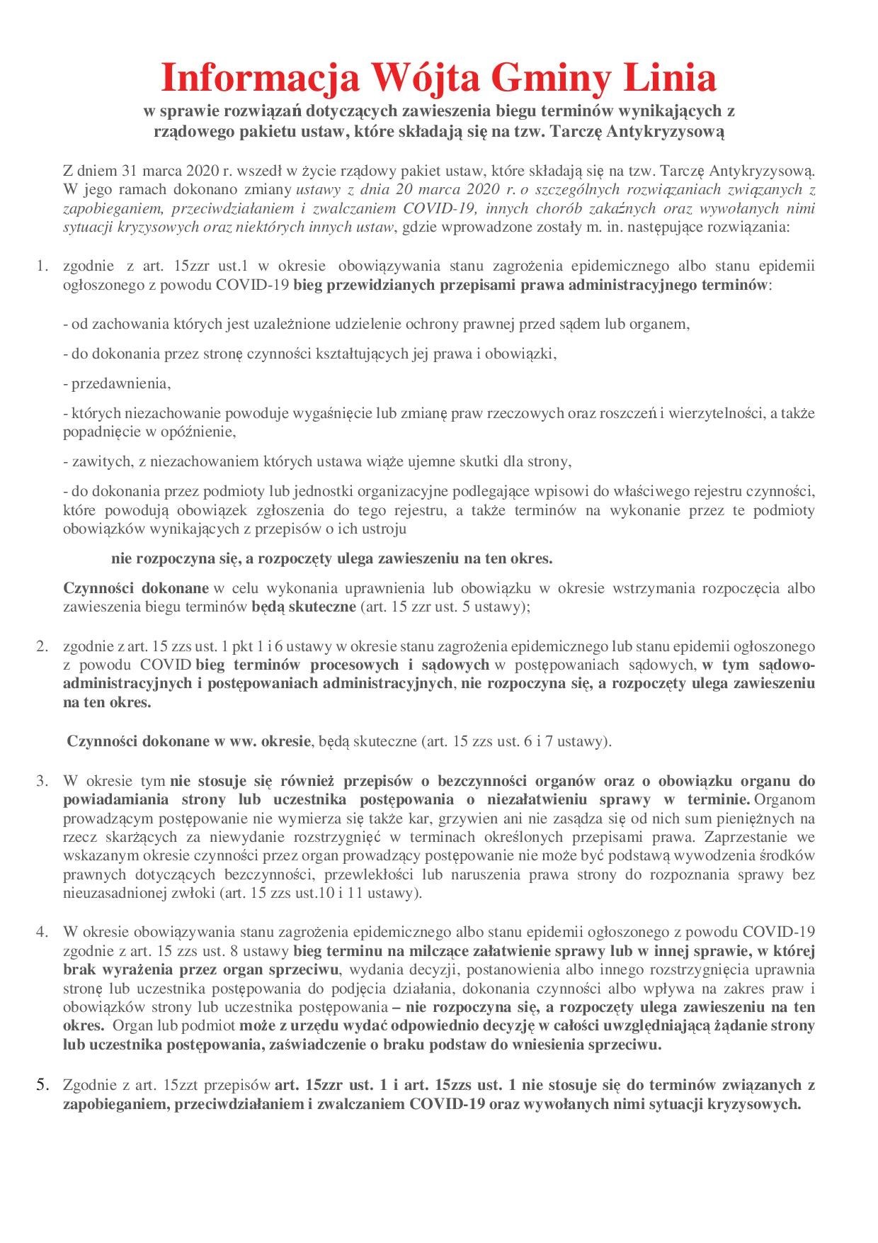 Informacja Wójta Gminy Linia w sprawie rozwiązań dotyczących zawieszenia biegu terminów wynikających z rządowego pakietu ustaw, które składają się na tzw. Tarczę Antykryzysową