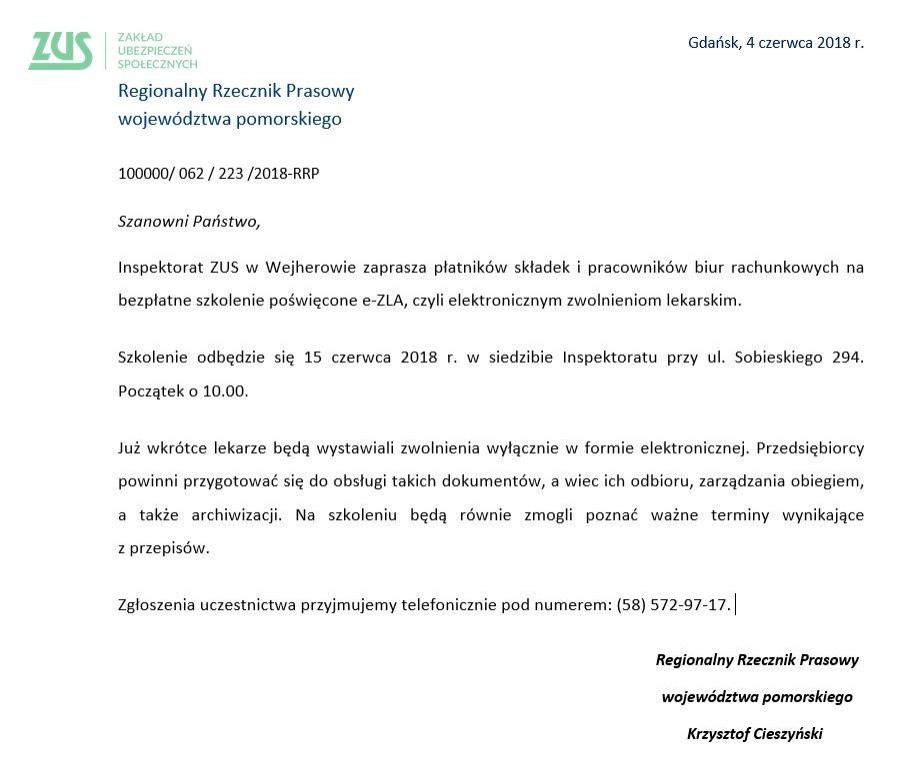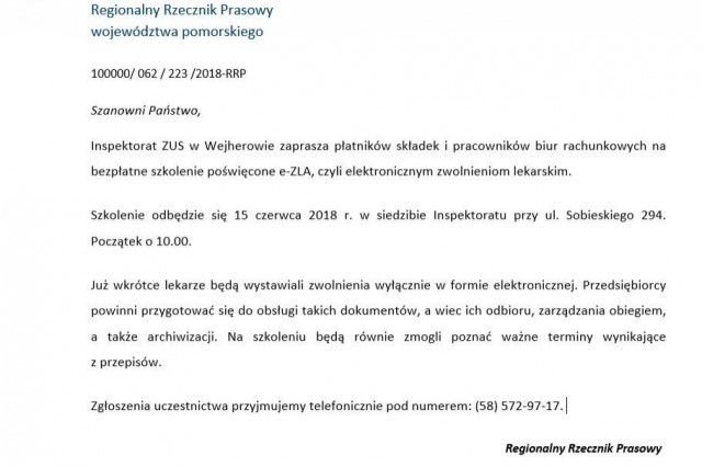 Inspektorat ZUS w Wejherowie zaprasza płatników składek i pracowników biur rachunkowych na bezpłatne szkolenie poświęcone e-ZLA, czyli elektronicznym zwolnieniom lekarskim.