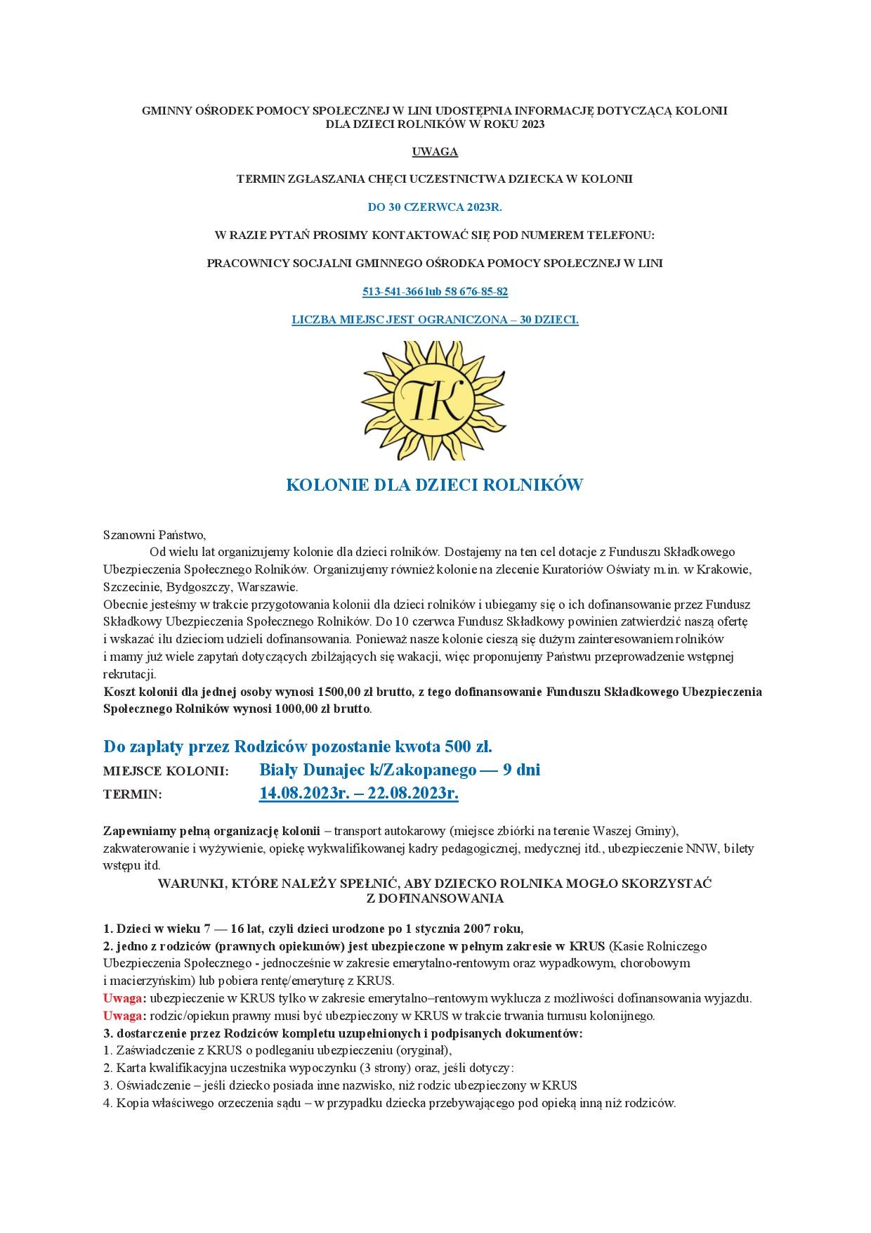 KOLONIE DLA DZIECI ROLNIKÓW - LATO 2024 (GÓRY - Biały Dunajec k/Zakopanego i MORZE - Gościno k/Kołobrzegu)