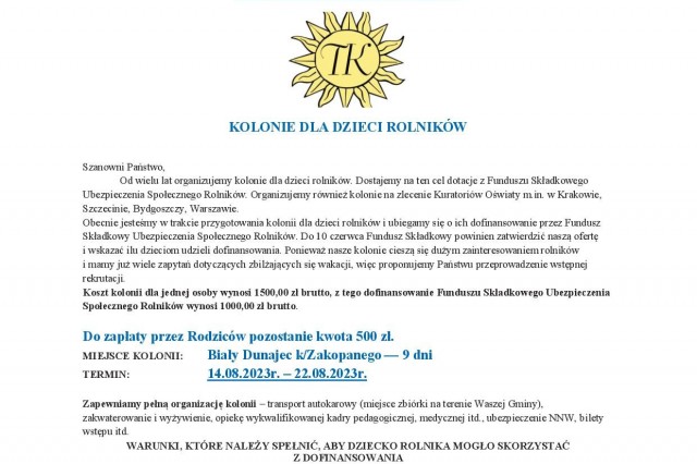 KOLONIE DLA DZIECI ROLNIKÓW - BIAŁY DUNAJEC 05.08.2023r. - 13.08.2023r.