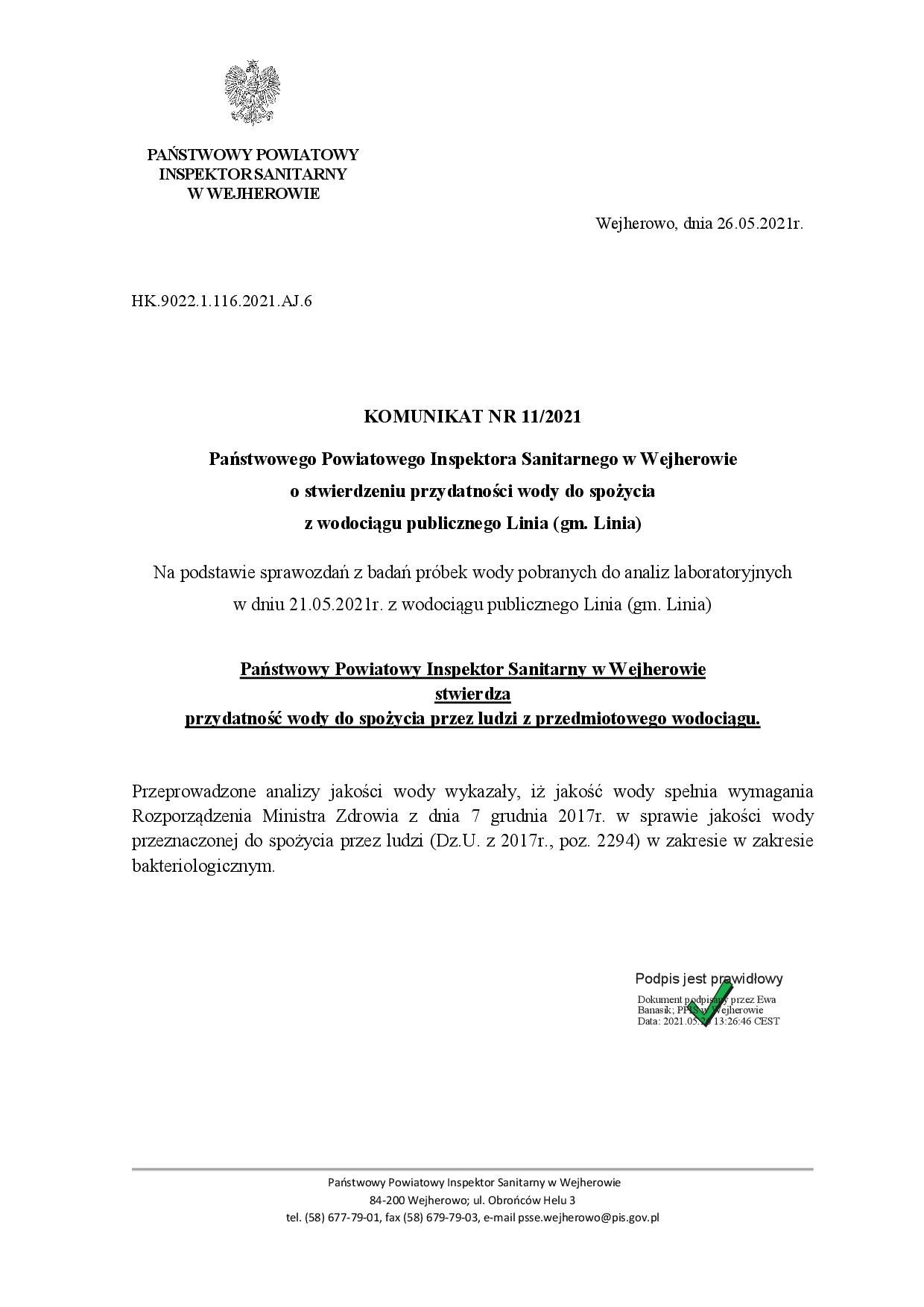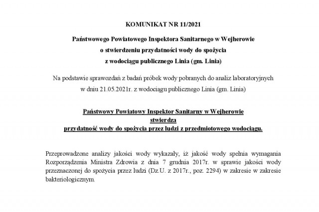 Komunikat o stanie wody z ujęć Linia