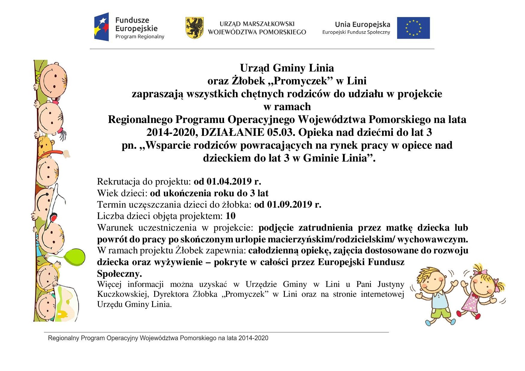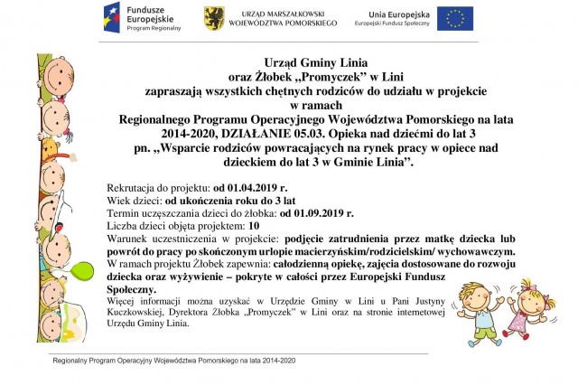 „Wsparcie rodziców powracających na rynek pracy w opiece nad dzieckiem do lat 3 w Gminie Linia” realizowanego w ramach działania 05.03 Opieka nad dziećmi do lat 3