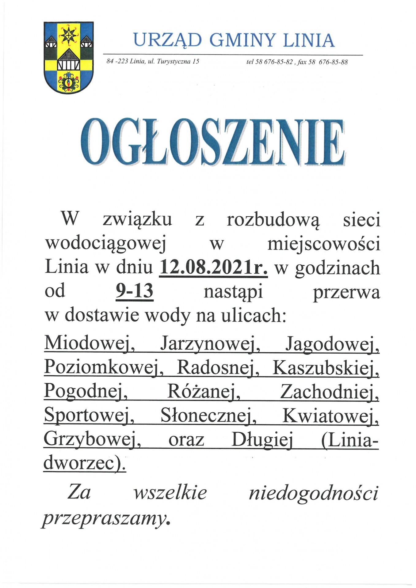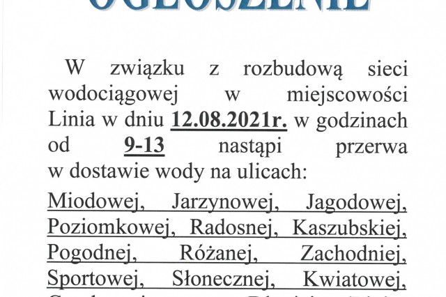 Ogłoszenie o przerwie w dostawie wody - Linia w...