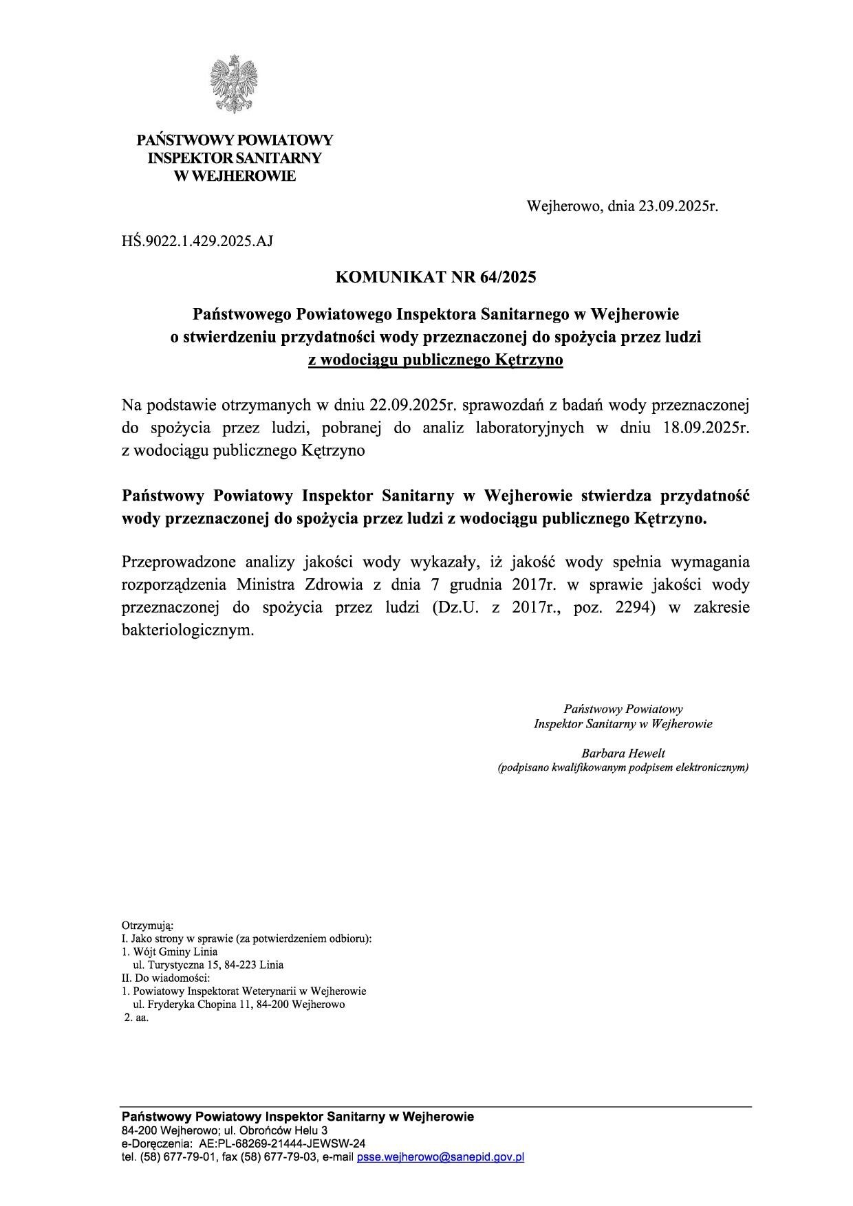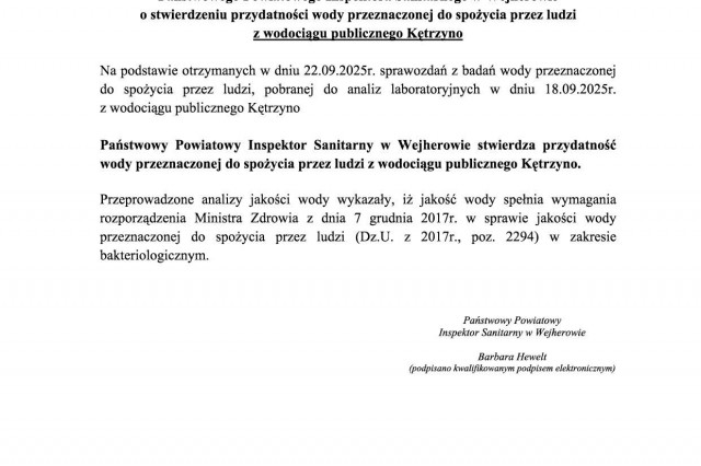 Państwowego Powiatowego Inspektora Sanitarnego w Wejherowie o stwierdzeniu przydatności wody przeznaczonej do spożycia przez ludzi z wodociągu publicznego Kętrzyno