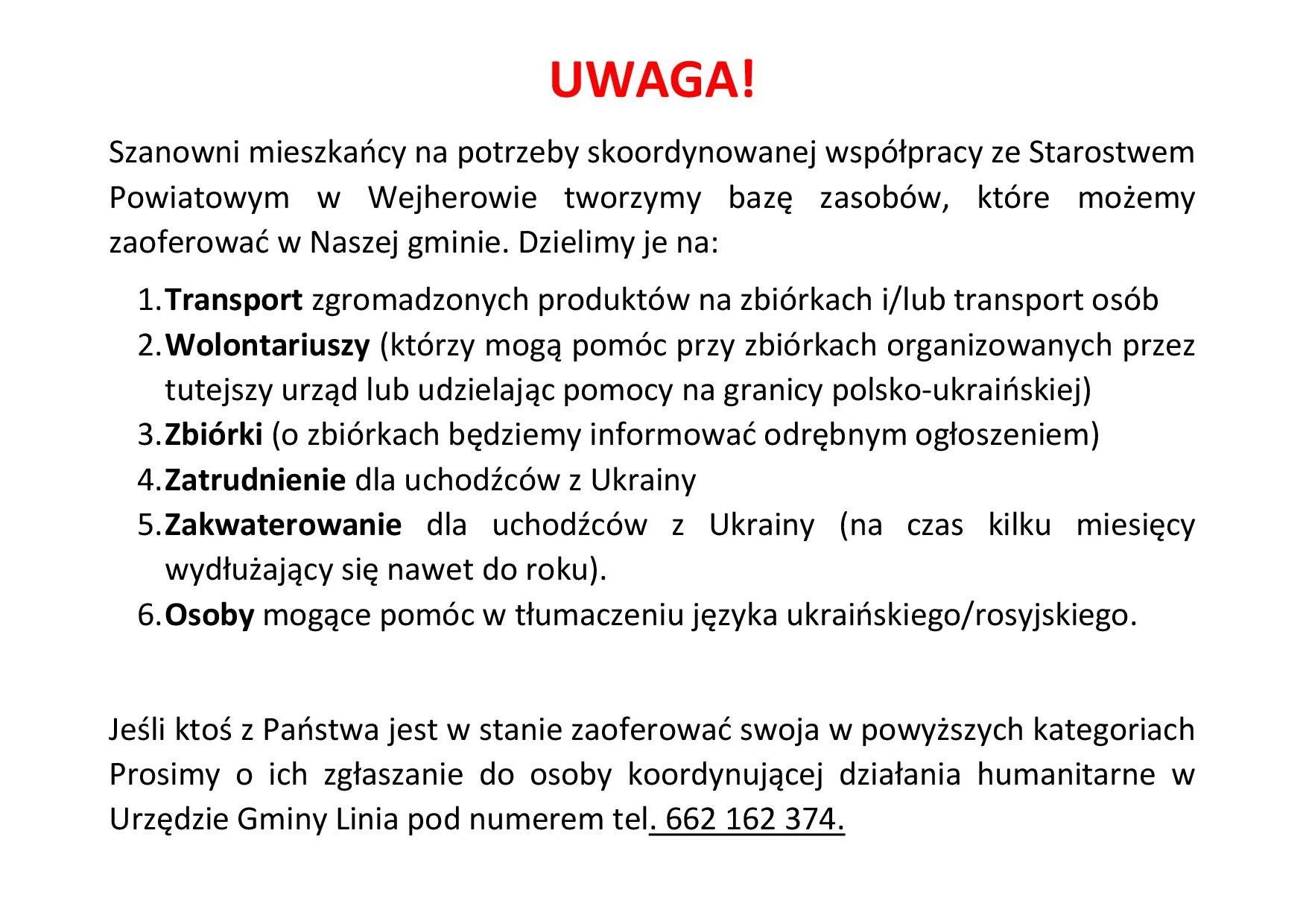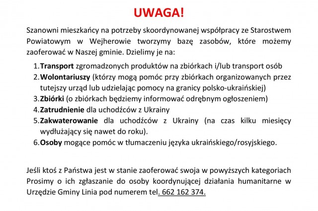 Jeśli ktoś z Państwa jest w stanie zaoferować swoja w powyższych kategoriach Prosimy o ich zgłaszanie do osoby koordynującej działania humanitarne w Urzędzie Gminy Linia pod numerem tel. 662 162 374.