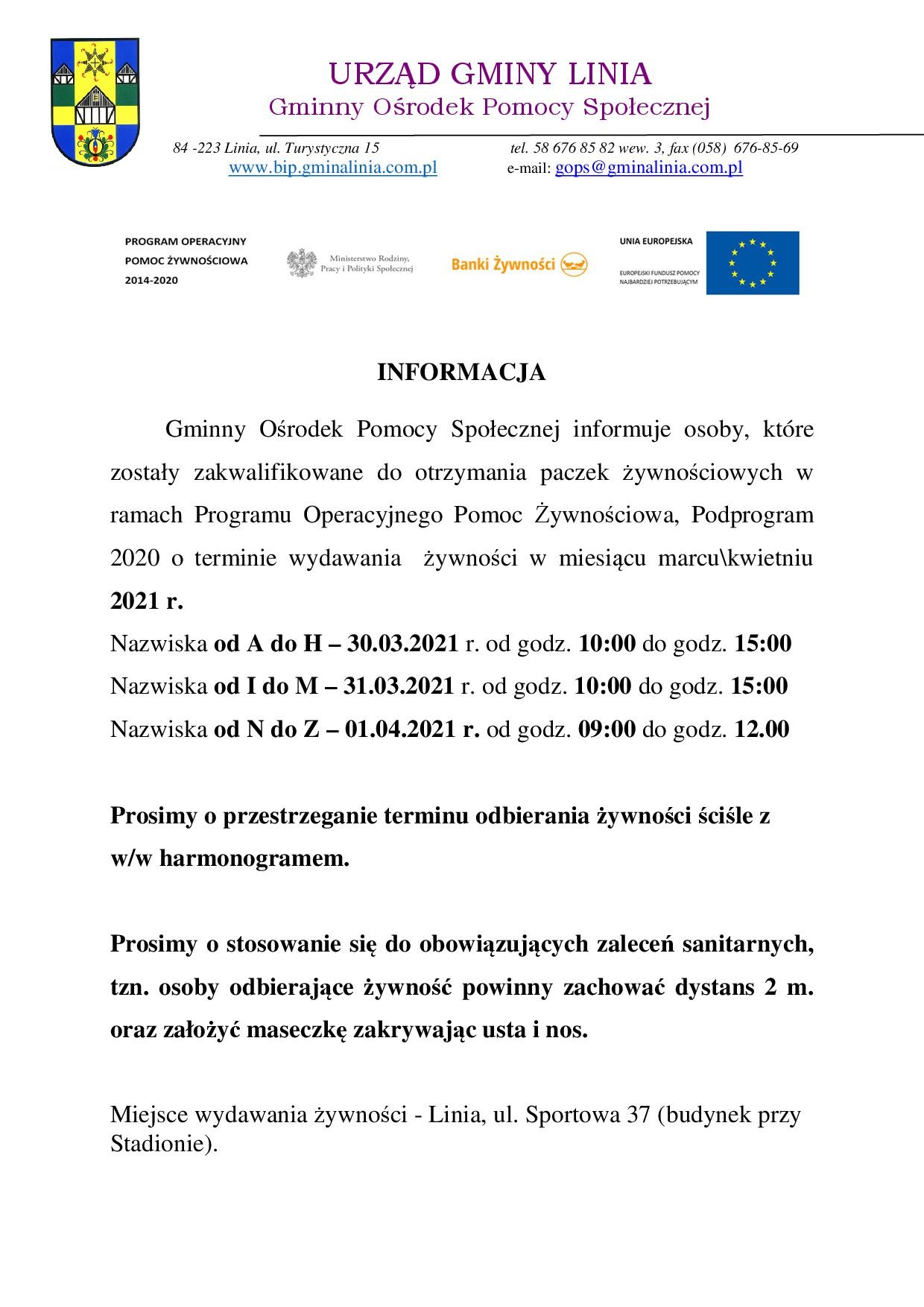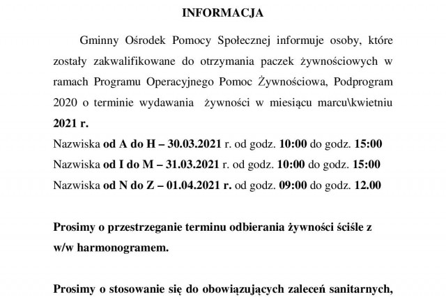 Informacja o wydawaniu paczek żywnościowych