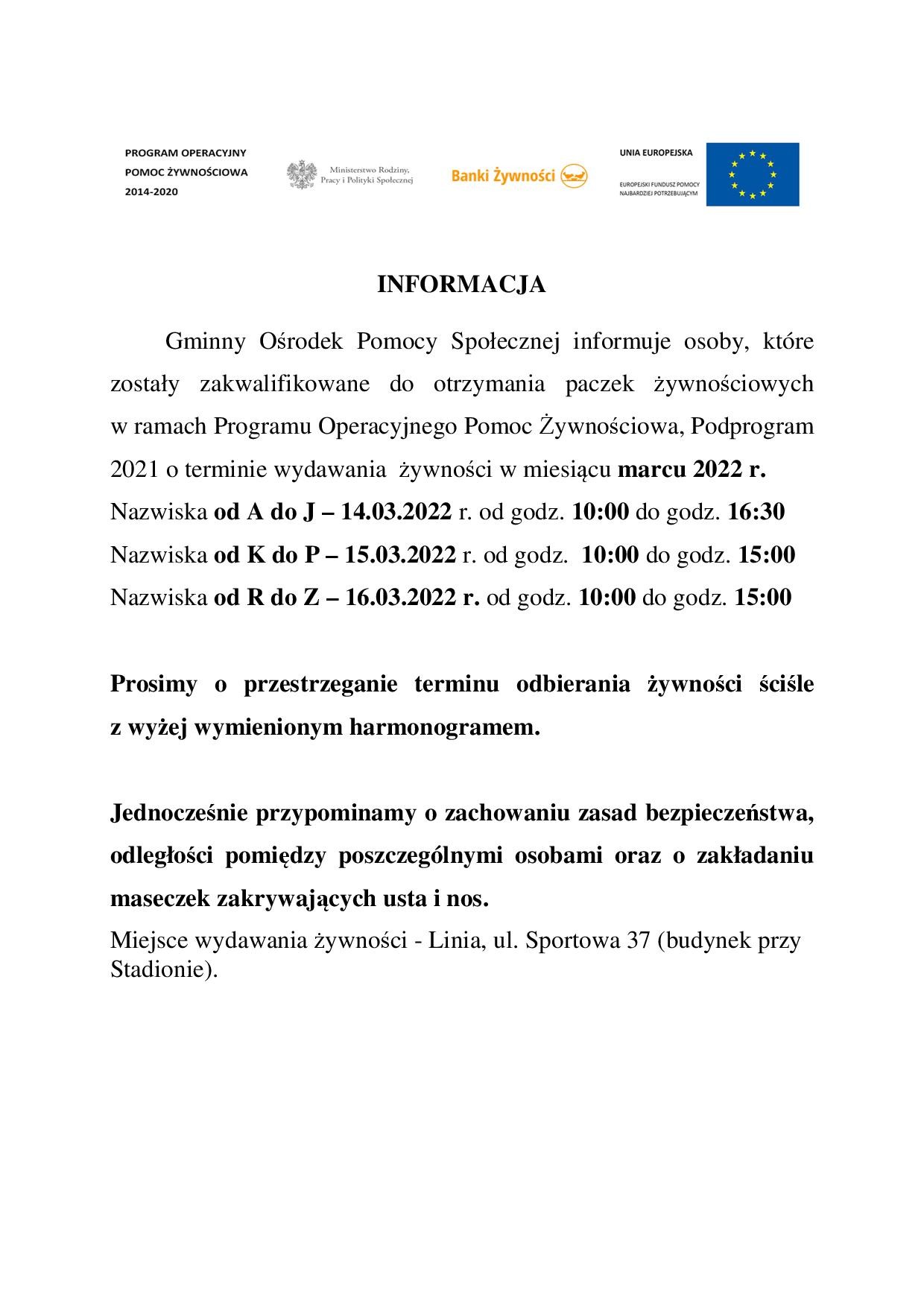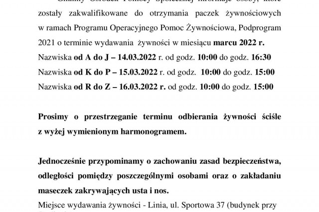 Gminny Ośrodek Pomocy Społecznej informuje osoby, które zostały zakwalifikowane do otrzymania paczek żywnościowych w ramach Programu Operacyjnego Pomoc Żywnościowa, Podprogram 2021 o terminie wydawania żywności w miesiącu marcu 2022 r.