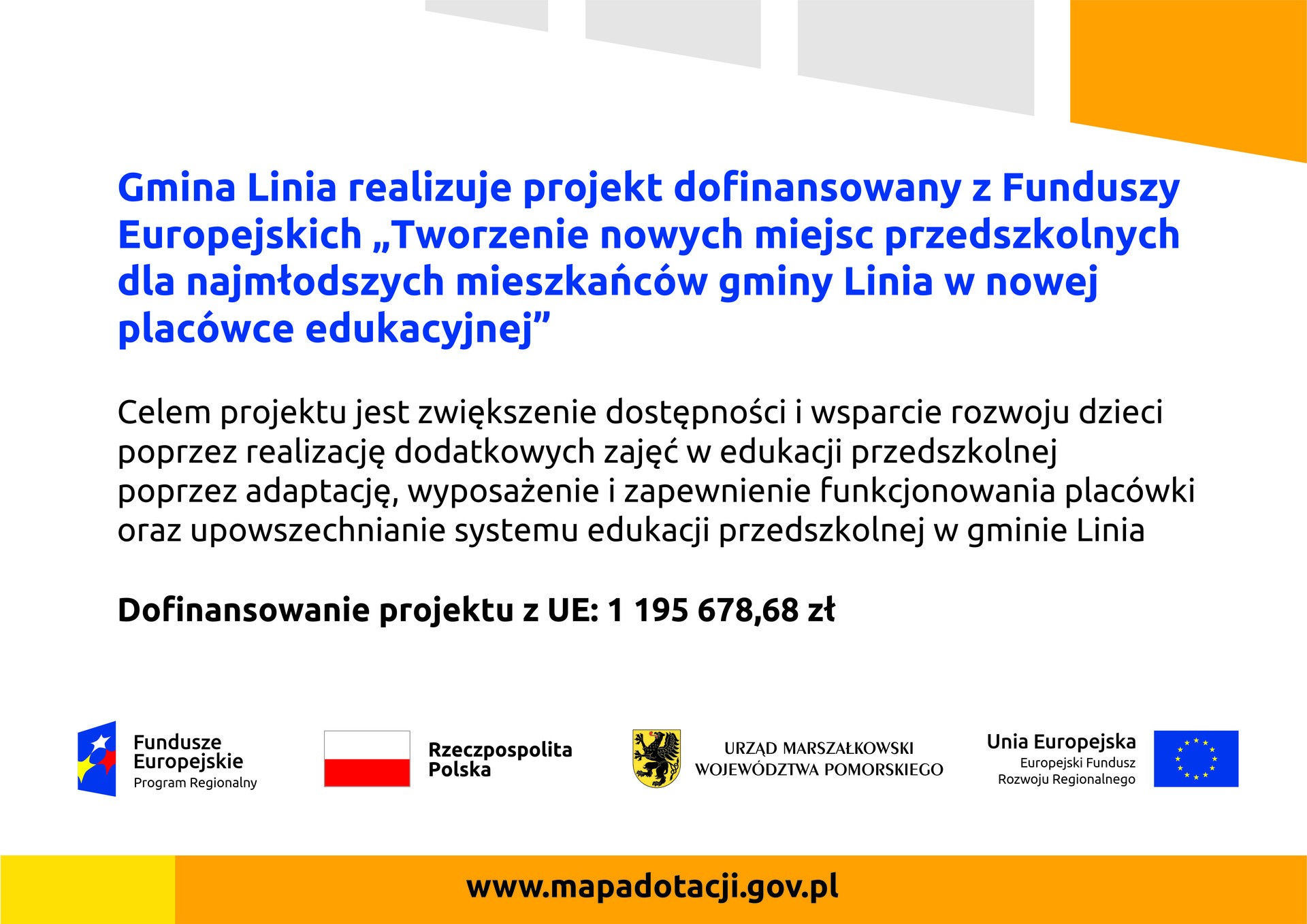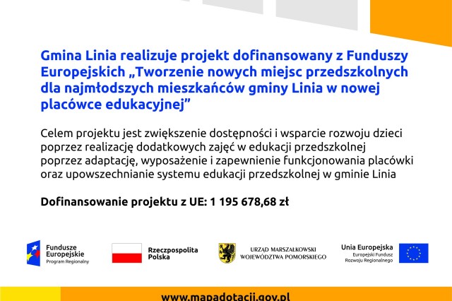 Informujemy, że Gmina Linia wystąpiła do Urzędu Marszałkowskiego o zgodę na objęcie projektem dodatkowych 10 dzieci w ramach projektu „Tworzenie nowych miejsc przedszkolnych dla najmłodszych mieszkańców gminy Linia w nowej placówce edukacyjnej”. Do dnia dzisiejszego nie mamy jeszcze potwierdzenia co do akceptacji naszego wniosku. Z uwagi na powyższe a także wydane Zarządzenie Wójta Gminy Linia nr 44/2019 z 6.05.2019 r. informujemy, że rekrutacja uzupełniająca będzie prowadzona od dnia 1.08.2019 r. do 17.08.2019 r. warunkowo. Oznacza to, że dzieci zakwalifikowane do projektu zostaną nim objęte tylko w przypadku uzyskania zgody Instytucji Zarządzającej. W związku ze zbliżającym się terminem przypominamy o konieczności złożenia nowego wniosku do rekrutacji uzupełniającej. Dokumenty dostępne są na stronie https://www.gminalinia.com.pl/projekty-eu-2/tworzenie-nowych-miejsc-przedszkolnych-dla-najmlodszych-mieszkancow-gminy-linia-w-nowej-placowce-edukacyjnej-2/