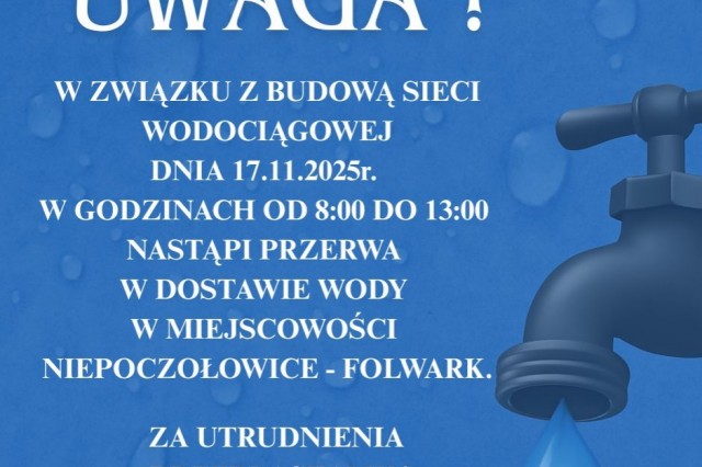 Przerwa w dostawie wody w miejscowości Niepoczołowice - Folwark