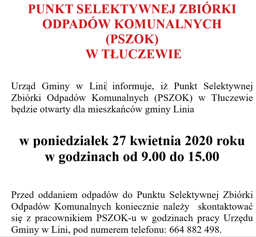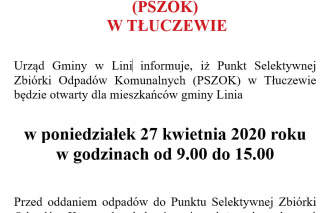 PSZOK w Tłuczewie otwarty w poniedziałek 27.04....