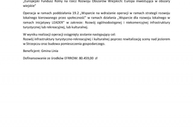 „Rewitalizacja sceny nad jeziorem w Strzepczu oraz budowa pomieszczenia gospodarczego” współfinansowana jest ze środków Unii Europejskiej.