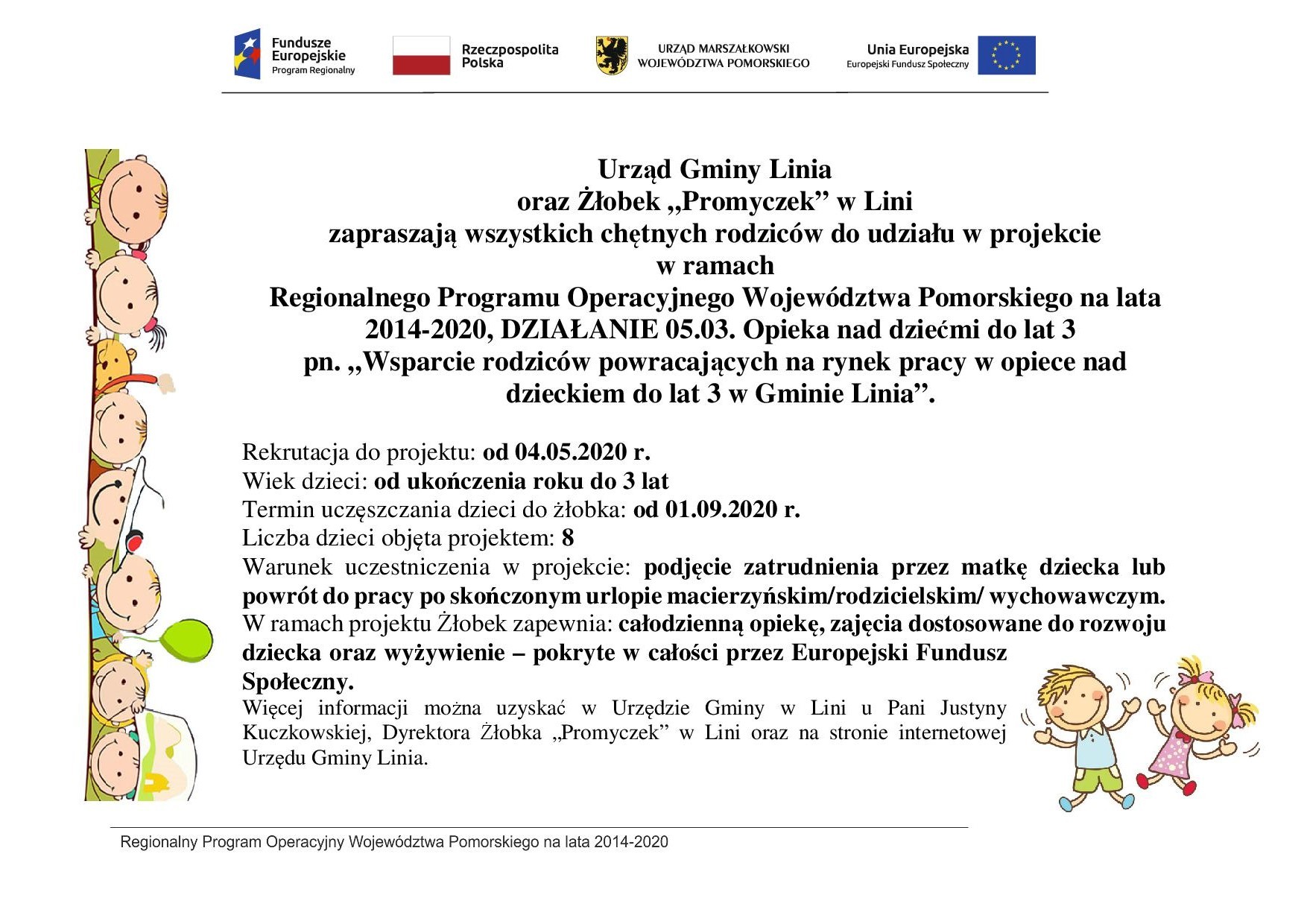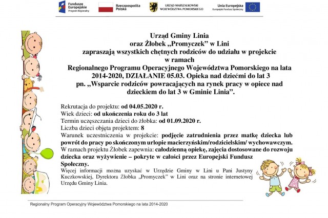 „Wsparcie rodziców powracających na rynek pracy w opiece nad dzieckiem do lat 3 w Gminie Linia” realizowanego w ramach działania 05.03 Opieka nad dziećmi do lat 3