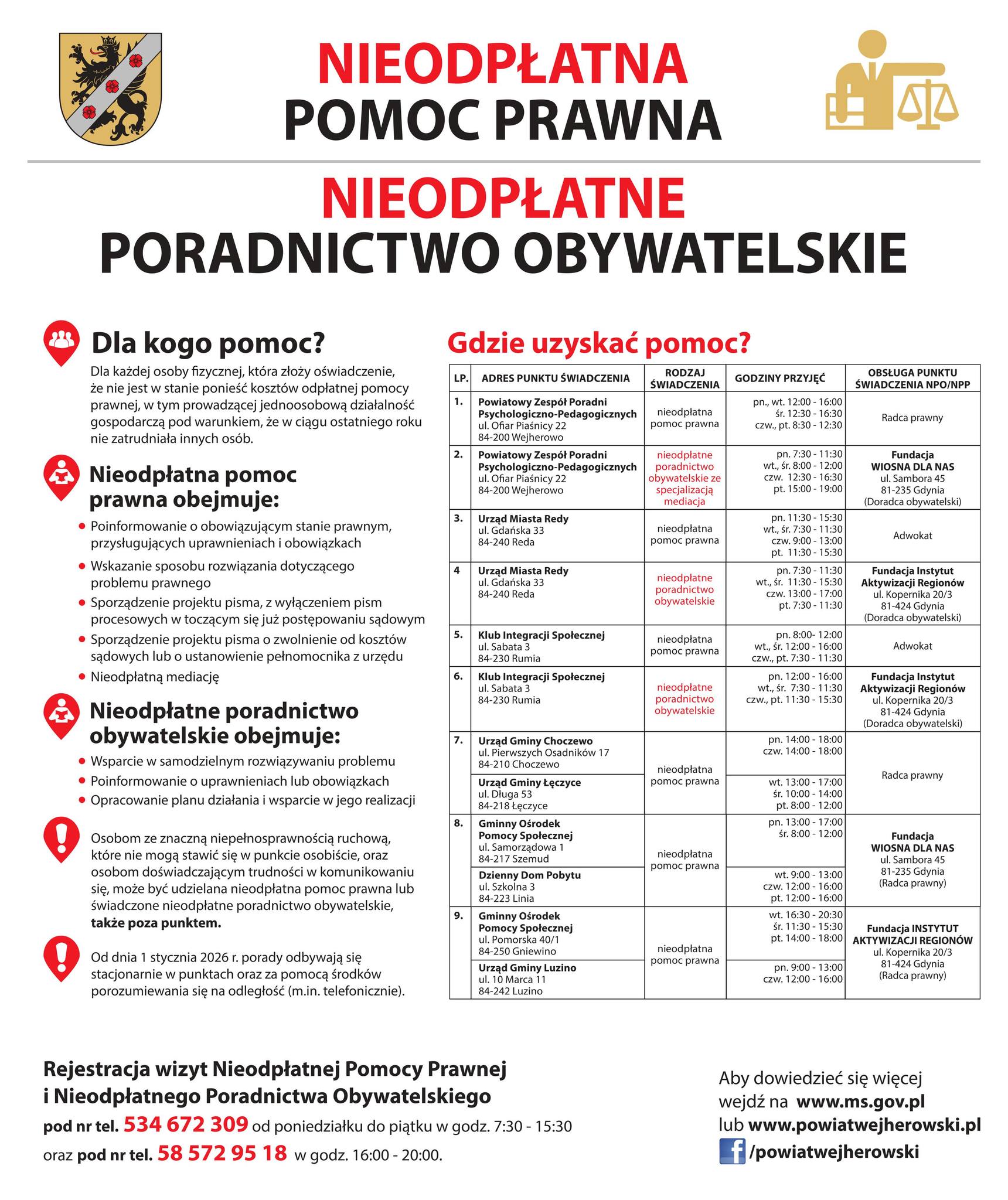 | | Gminny Ośrodek Pomocy Społecznej ul. Pomorska 40/1 84-250 Gniewino | wt. 8:00 - 12:00 śr. 14:00 - 18:00 pt. 14:00 - 18:00 | Fundacja INSTYTUT AKTYWIZACJI REGIONÓW ul. Kopernika 20/3 81-424 Gdynia (2 Radców prawnych) |